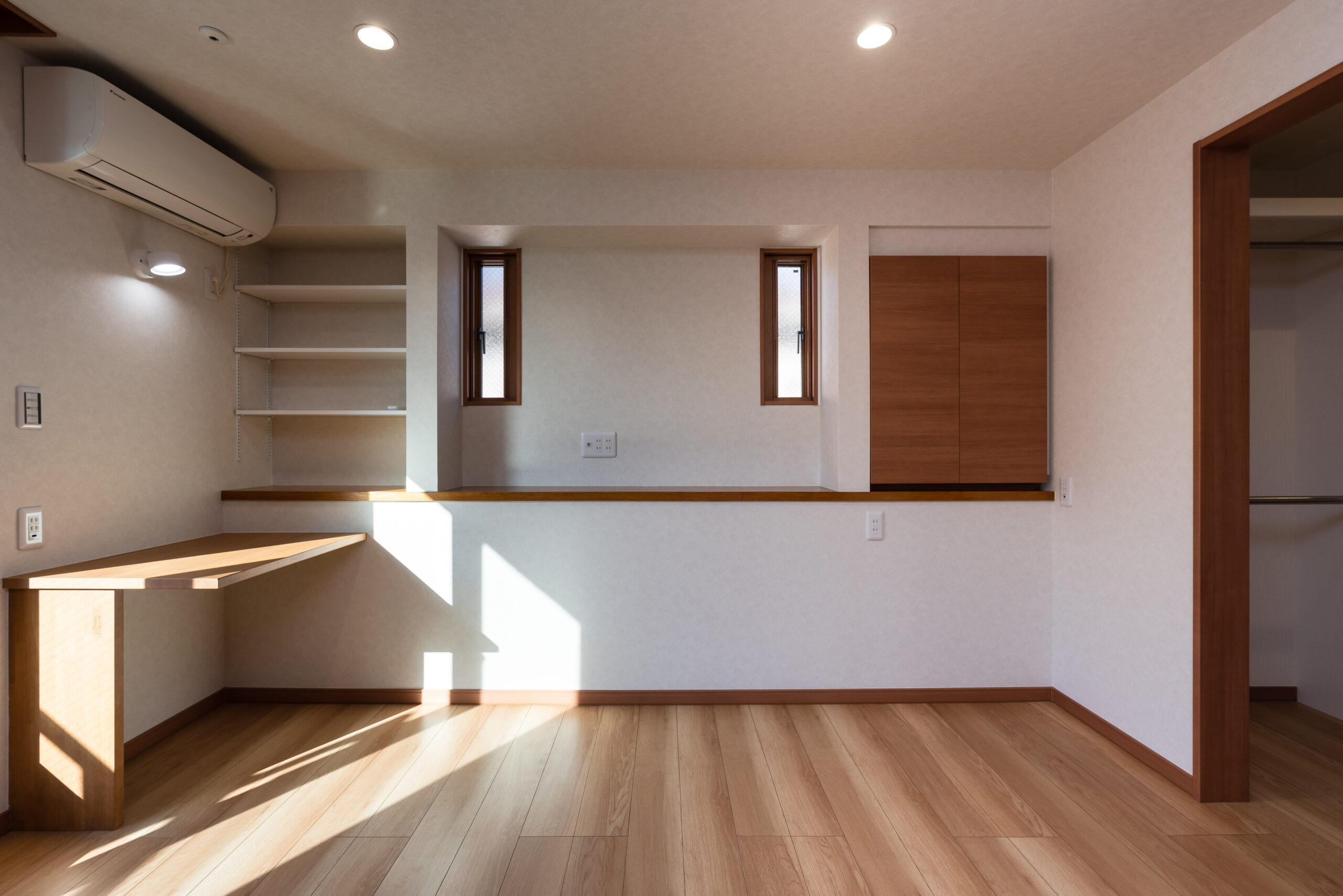 明るい窓際にはL型のカウンターデスクと可動棚を造作し、趣味のスペースとして活用できるようにしました。