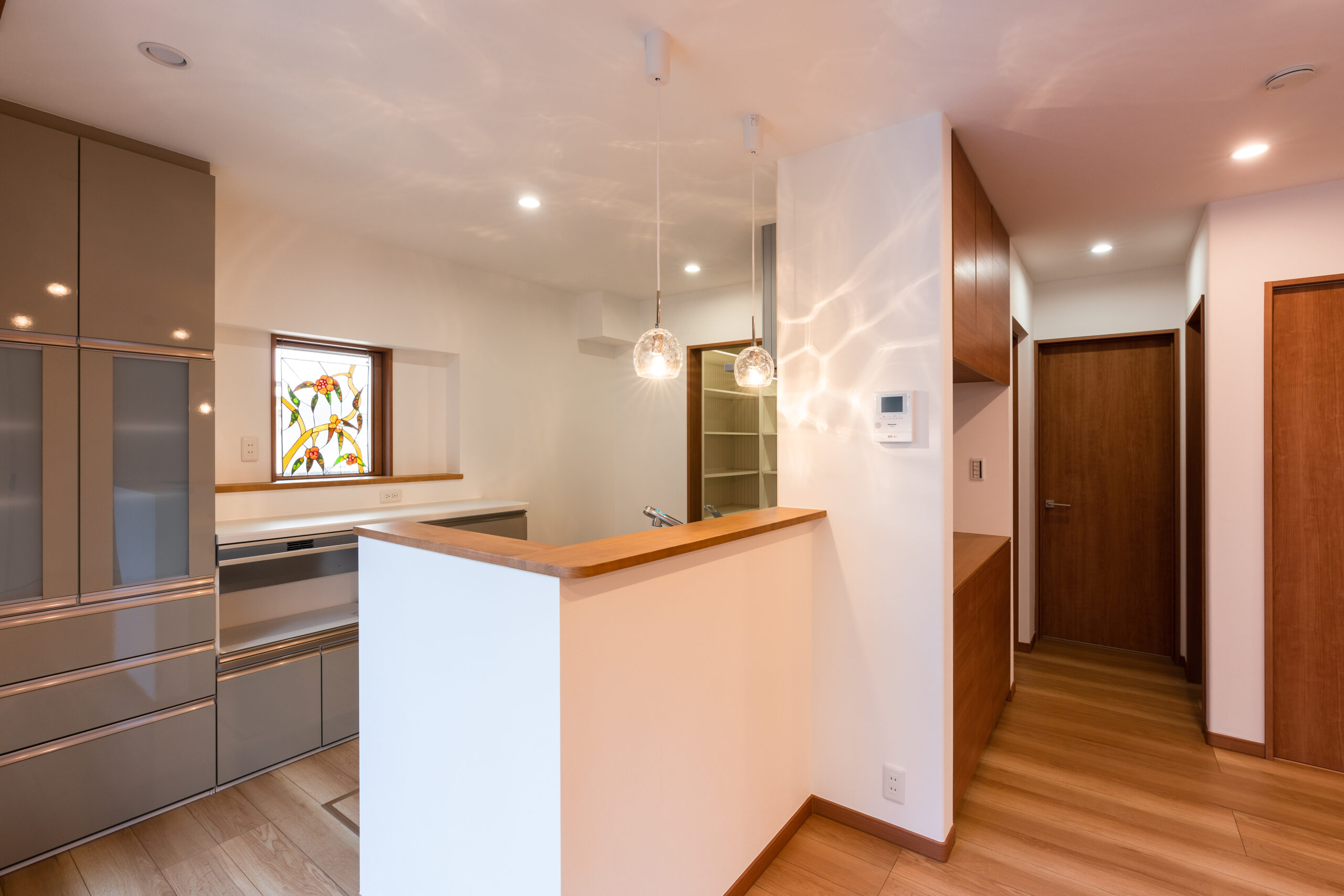 お施主様のご希望により、美しいステンドグラスを取り付け、空間に華やかさを添えています。