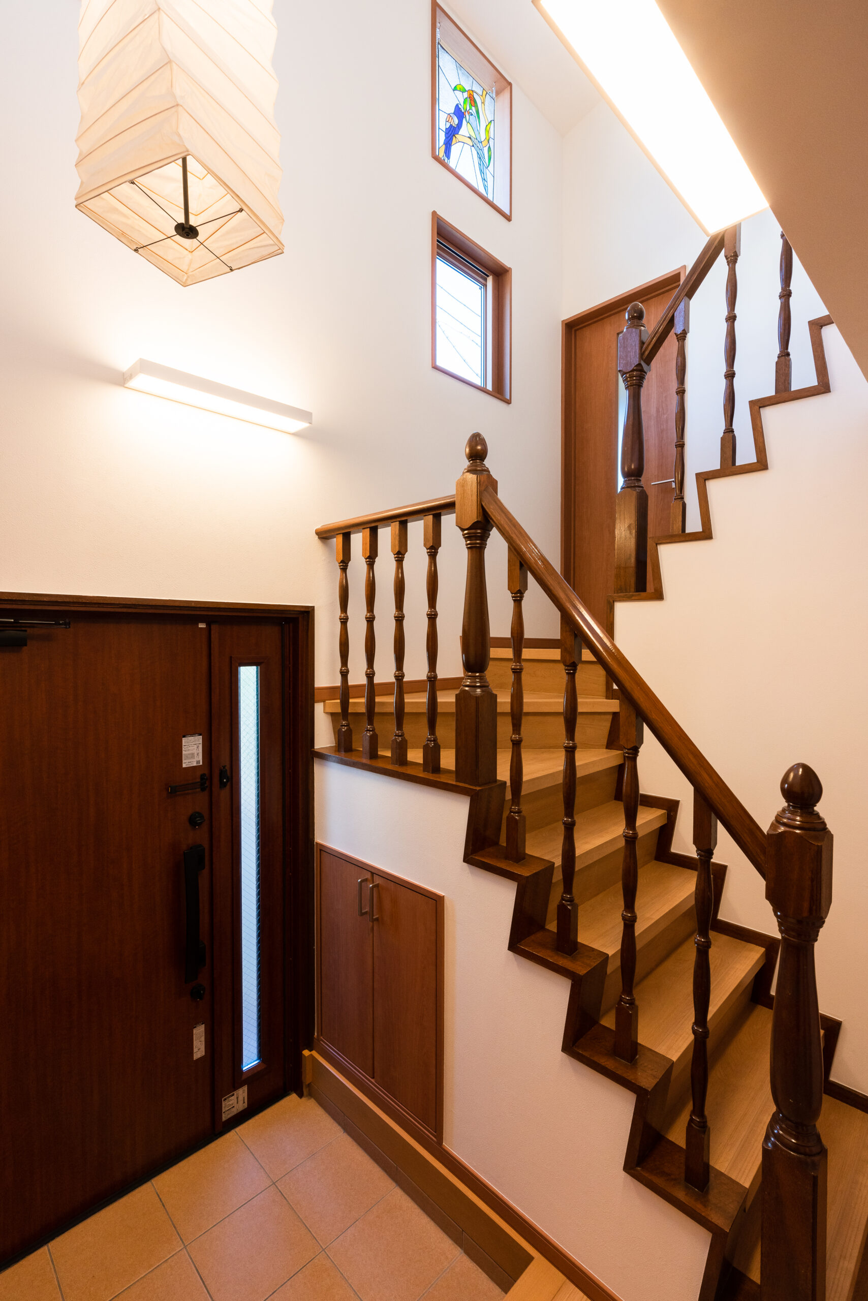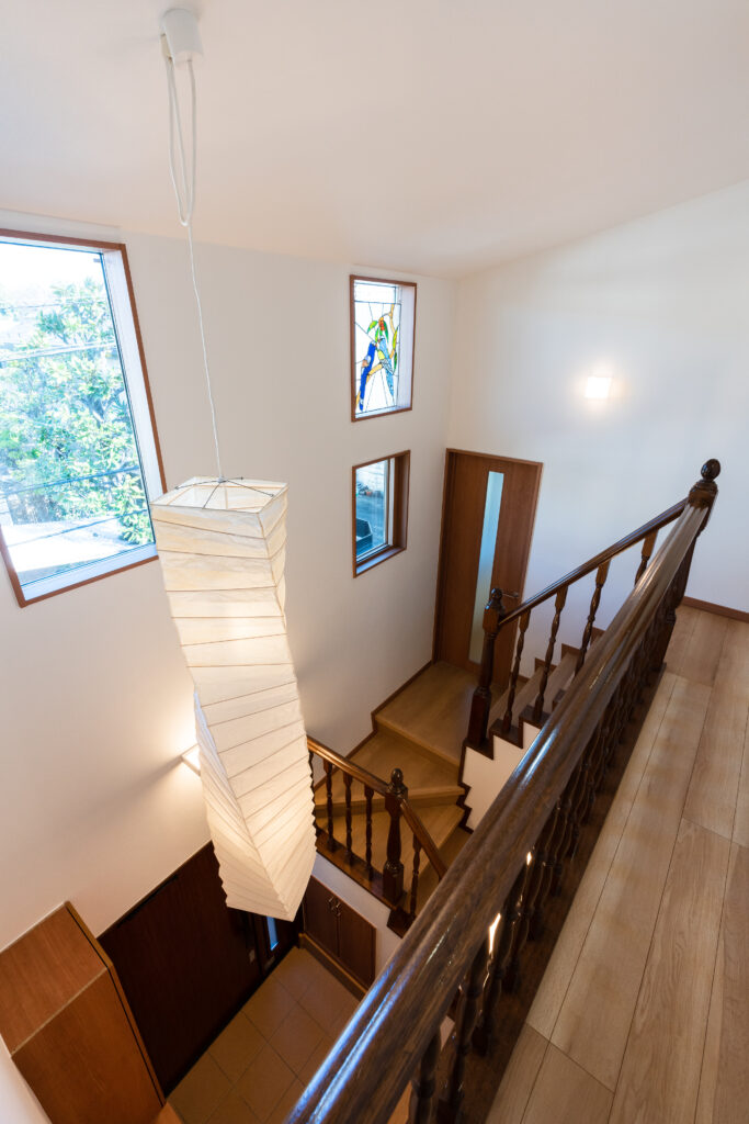 吹き抜けの玄関には、和紙のペンダントライトを選びました。